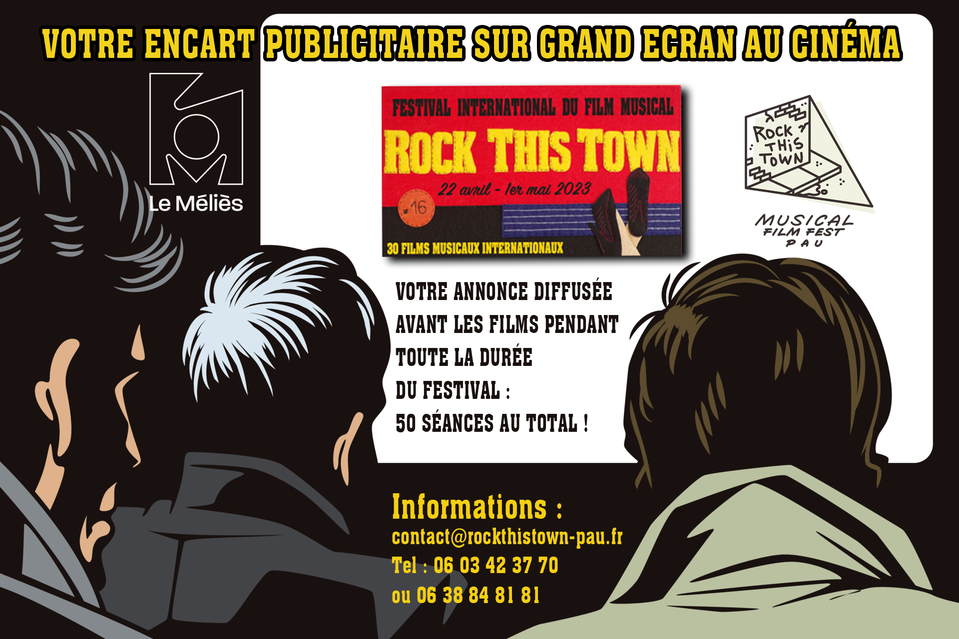 On recherche des sponsors ! Vous avez un commerce, un événement, une structure à faire connaître ? Vous voulez soutenir notre festival tout en assurant la promotion de votre établissement ? Profitez des écrans du Cinéma Le Méliès pour une campagne promo originale et efficace durant toute la période du festival Rock This Town ! Votre encart publicitaire sera projeté en avant programme sur plus de 60 séances cinéma du 3 mai au 12 mai 2024. Informations tarifaires et modalités : contact@rockthistown-pau.fr, ou par téléphone : Maxime Bur 06 15 67 69 00.